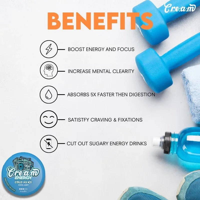 C.r.e.a.m Energy är en koffeinprodukt förpackad i små påsar för sublingual användning. Den erbjuder ett alternativ till traditionella energidrycker eller överdriven kaffekonsumtion.